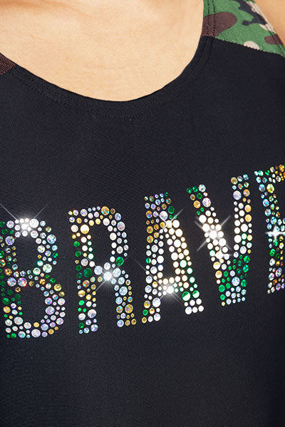 Lets be honest, gymnasts might be the most brave athletes out there! This on-trend camo printed mesh back leotard with BRAVE sequins will surely shine while you perform your tricks. Show them how brave you are! Includes coordinating scrunchie.