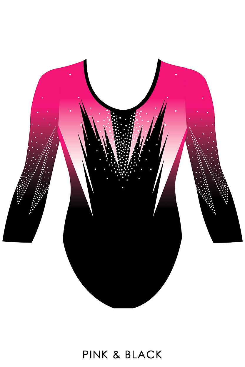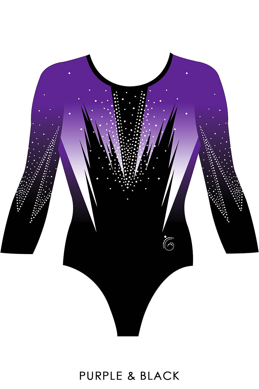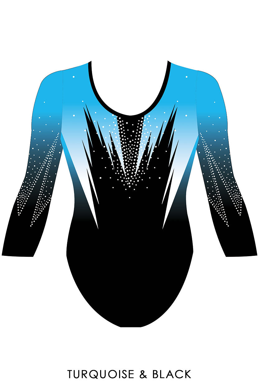The Custom Quick Edgy leotard in three quarter sleeve is a perfect competition leotard option for Levels 1-3, Xcel, High School teams and beyond! The rhinestone design on the front, back and sleeves of this leotard offers the right amount of elegant sparkle classic silhouette! Each leotard includes a coordinating scrunchie.