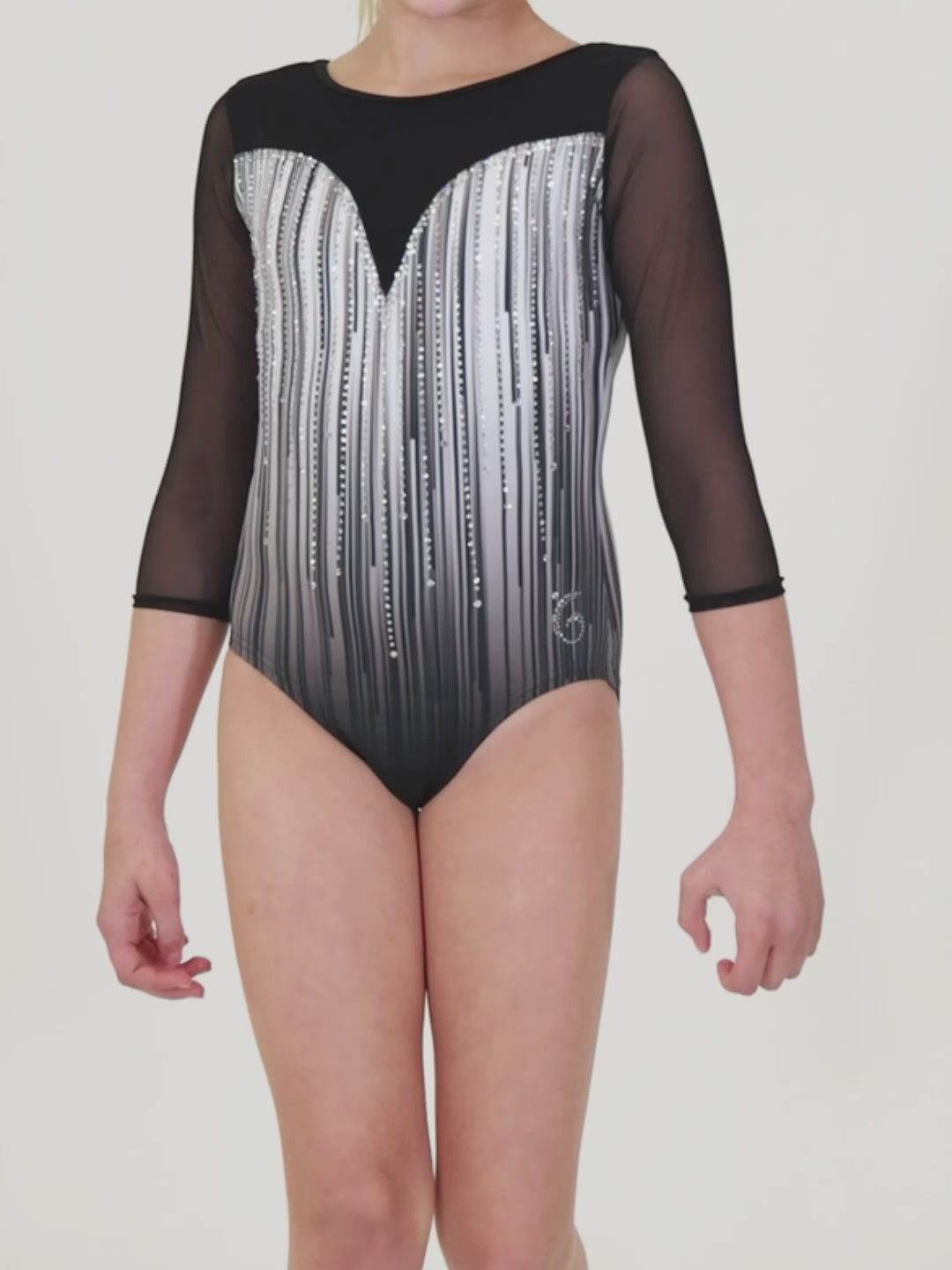 The Custom Quick Matrix leotard in long sleeve is a perfect competition leotard option for Levels 1-3, Xcel, High School teams and beyond! The rhinestone design on the front, back and sleeves of this leotard offers the right amount of elegant sparkle classic silhouette! Each leotard includes a coordinating scrunchie.