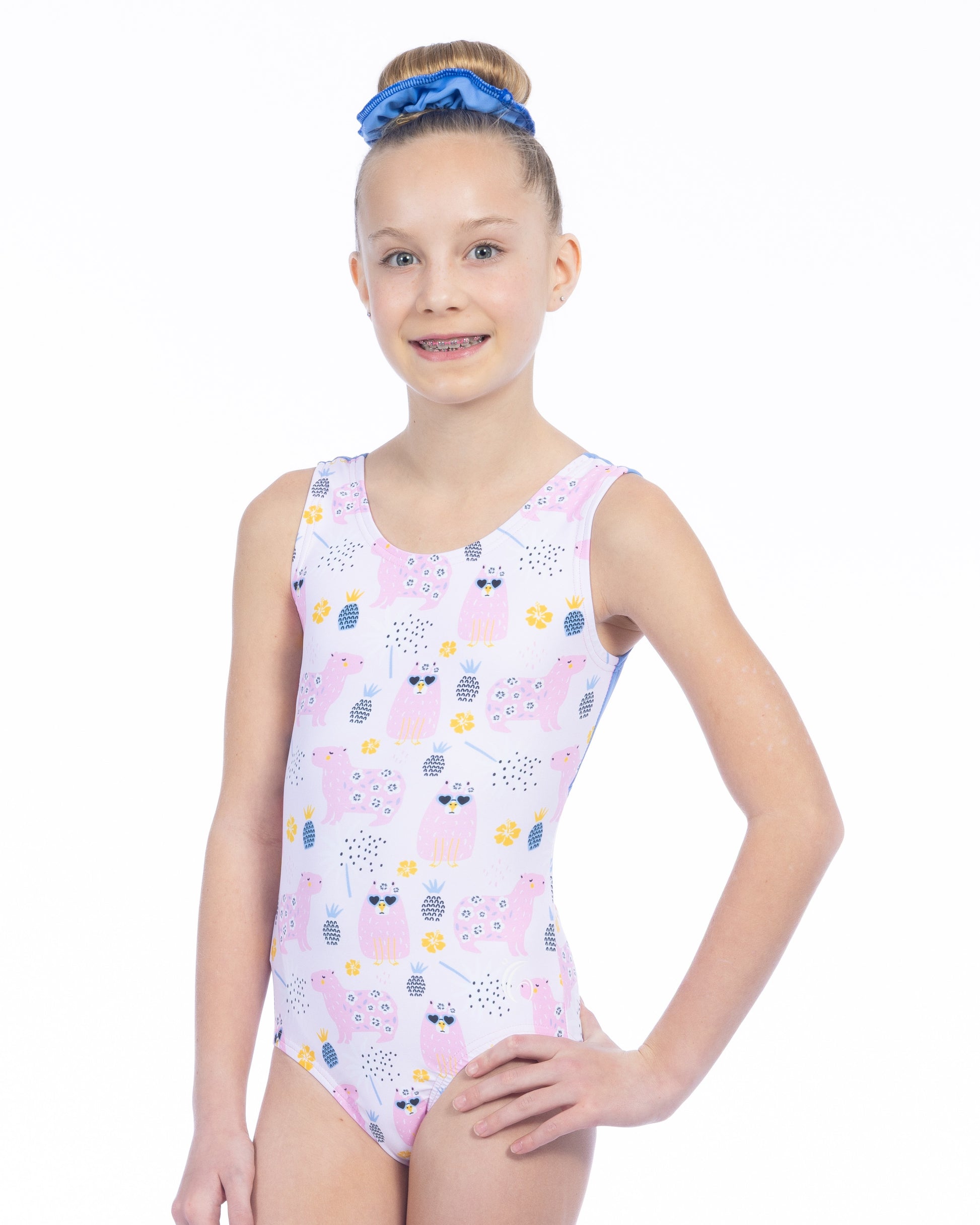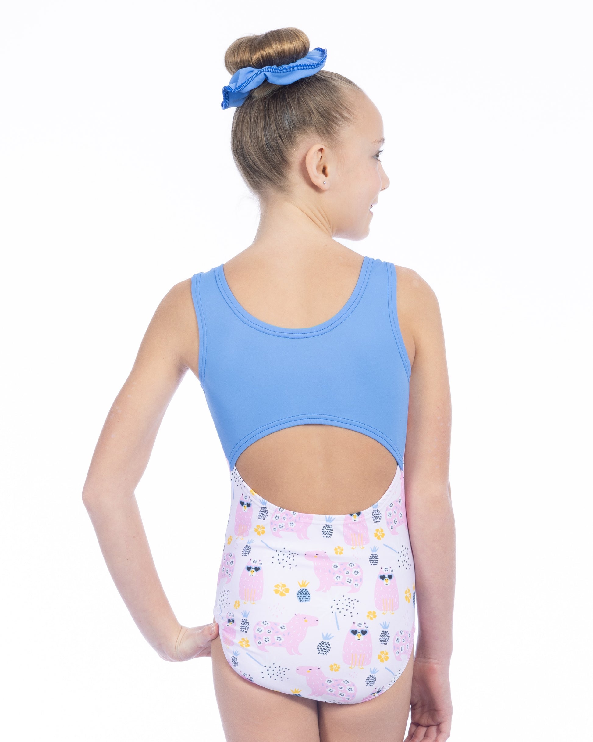 Be the friendliest gymnast on the floor in this adorable gymnastics leotard! Featuring our playful pink Cute Capybara print and a stylish open-back design with a pop of periwinkle on the upper back! Crafted from soft, stretchy spandex, it offers maximum comfort and flexibility for every routine. Coordinating scrunchie included. Proudly made in the USA!
