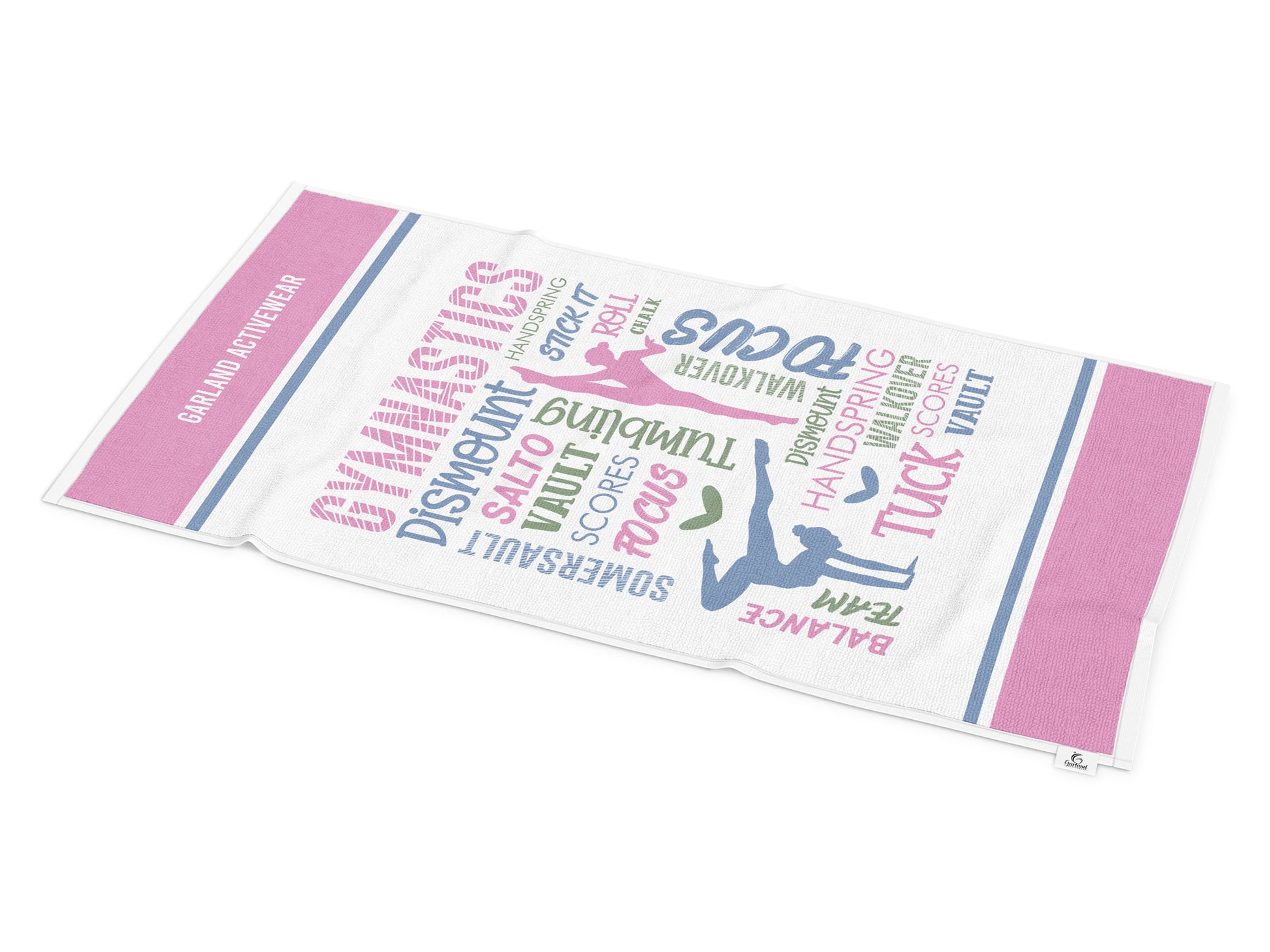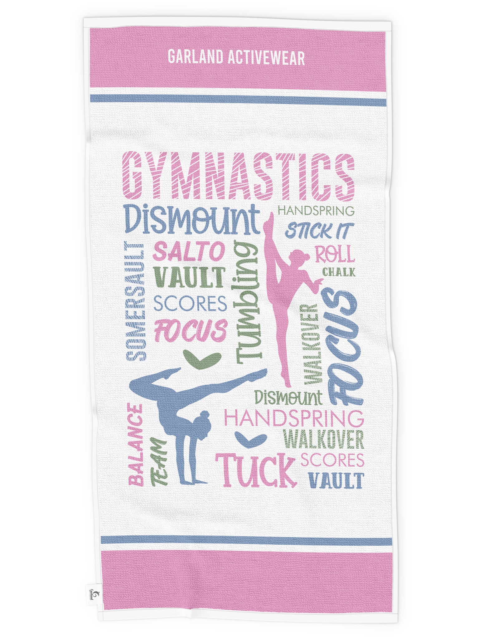 Get ready to hit the beach this summer with your edge to edge Garland gymnastics-inspired beach towel! Made with 100% cotton terry loops. Features premium sheared microfiber polyester face. Sizing of this towel is 35x65in!