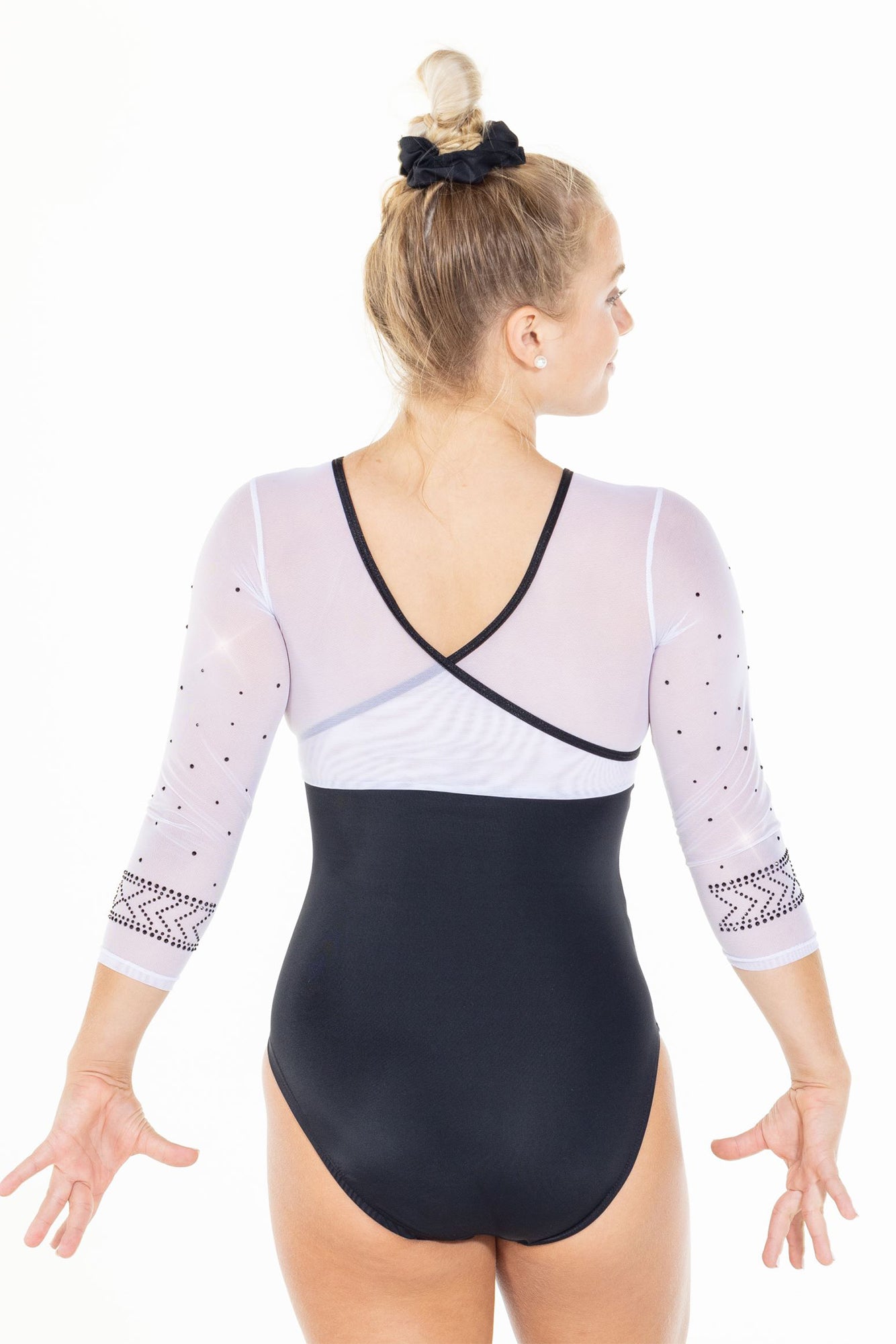 - All custom competihown in a Black spandex base with a teal mesh top with a cross-mesh back.tion leotards can be customized to your choice of colors and fabrics and embellishments can be added or removed.